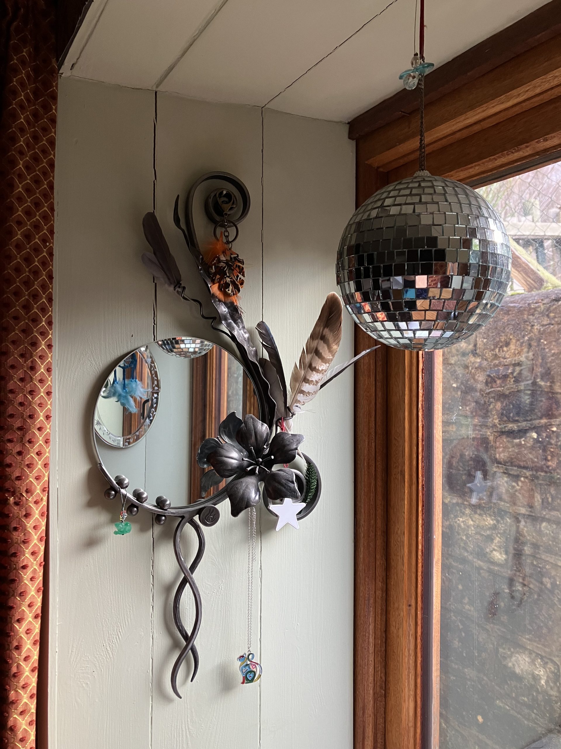 In my window I have a disco mirrorball, and when the sun shines from a certain angle the tiny mirrors cast a myriad of little rainbow lights across the floor, ceiling, walls and furniture, and if I spin the ball, the little rainbow lights dance around the room. It’s glorious to watch! Sometimes, I sit in the window to do my thinking, and I did this today, to think about what I wanted to write here. As soon as I got up there on the windowsill and pulled my legs up, sitting facing the mirrorball at eye level, I could see myself reflected in all those tiny mirrors. But here’s the thing. They were all only one little part of me – maybe an eye, a nose, a mouth, part of my hand, my clothing, my hair – and they were not cohesive like a regular mirror, these were kind of mixed up and in odd places, like a Picasso painting! And, if I spun the ball, all those parts of me flashed past and then regrouped in not quite the same places, as though the act of spinning, my movement, the sun, the passing of seconds, something, had altered the image of me just a little. I was not the same as I was before. I was all there, of course, every single part of me, just not in exactly the same formation. Still multifaceted. Maybe a couple of extra facets I hadn’t noticed before. Maybe a couple I had shed since the last time I looked closely at the ball. And all part of the dancing, rainbow-hued, textured, shiny, reflective, multifaceted and wondrous whole. It was quite a moment, seeing myself in that way, my very own glitterball version of me (which, when you come to know me, might seem appropriate). À la Picasso – and I’m happy with that.